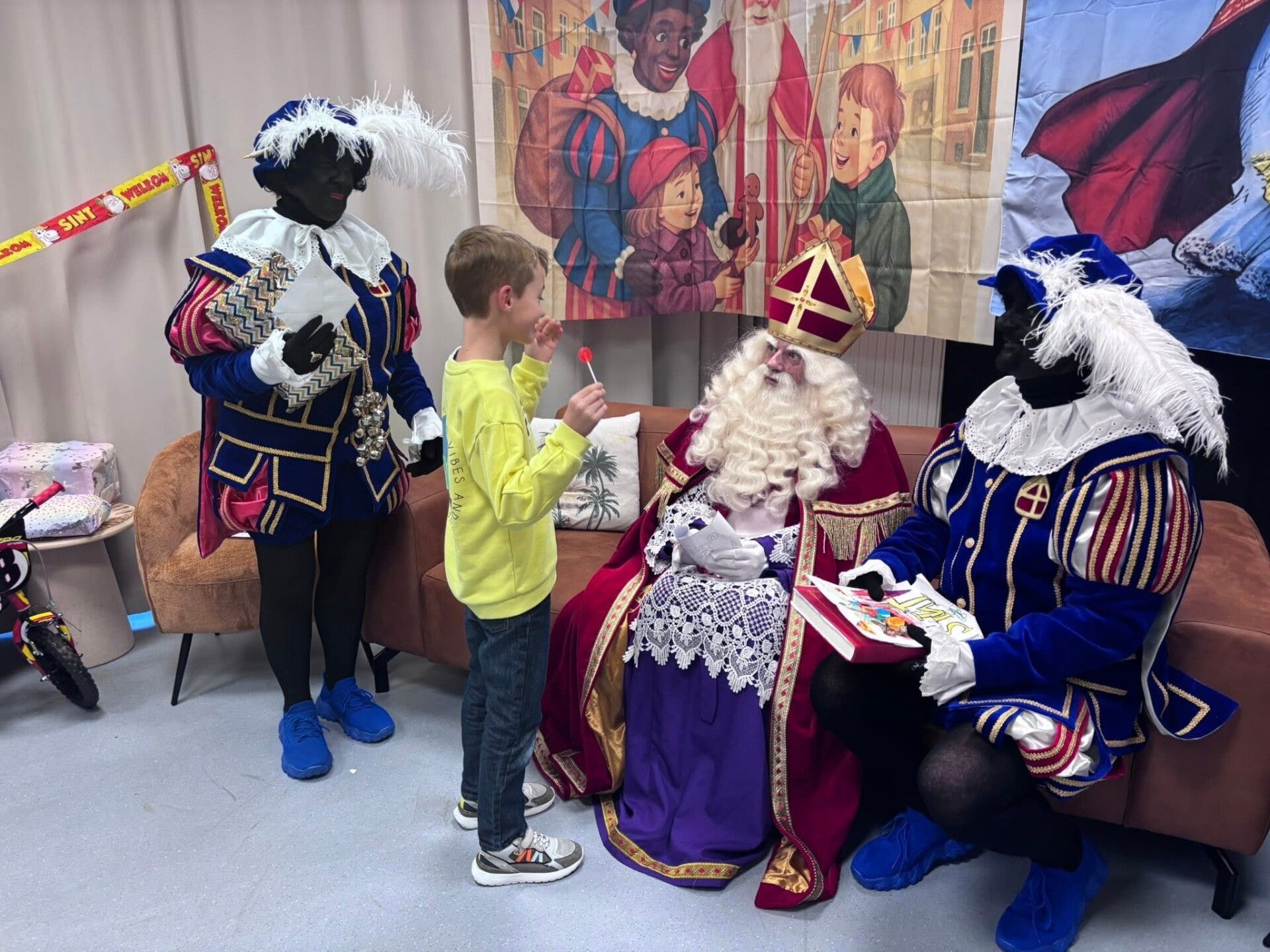 Sinterklaas en zijn Pieten op huisbezoek.